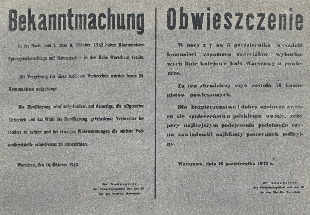 Niemieckie obwieszczenie informujące o powieszeniu „50 komunistów” za Wikipedia