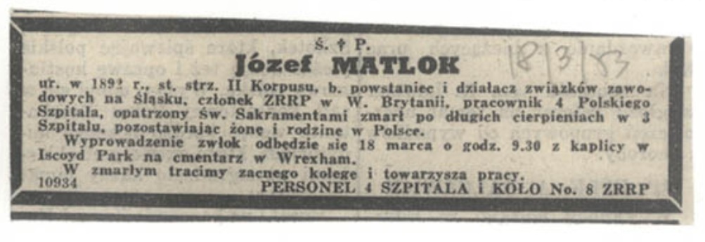 Zmarł 15 marca 1953 roku w Polskim Szpitalu w Penley.